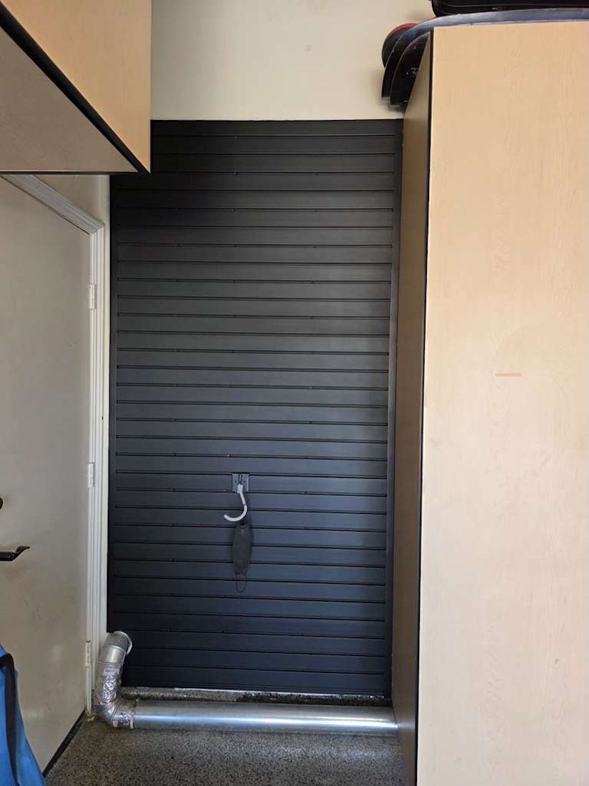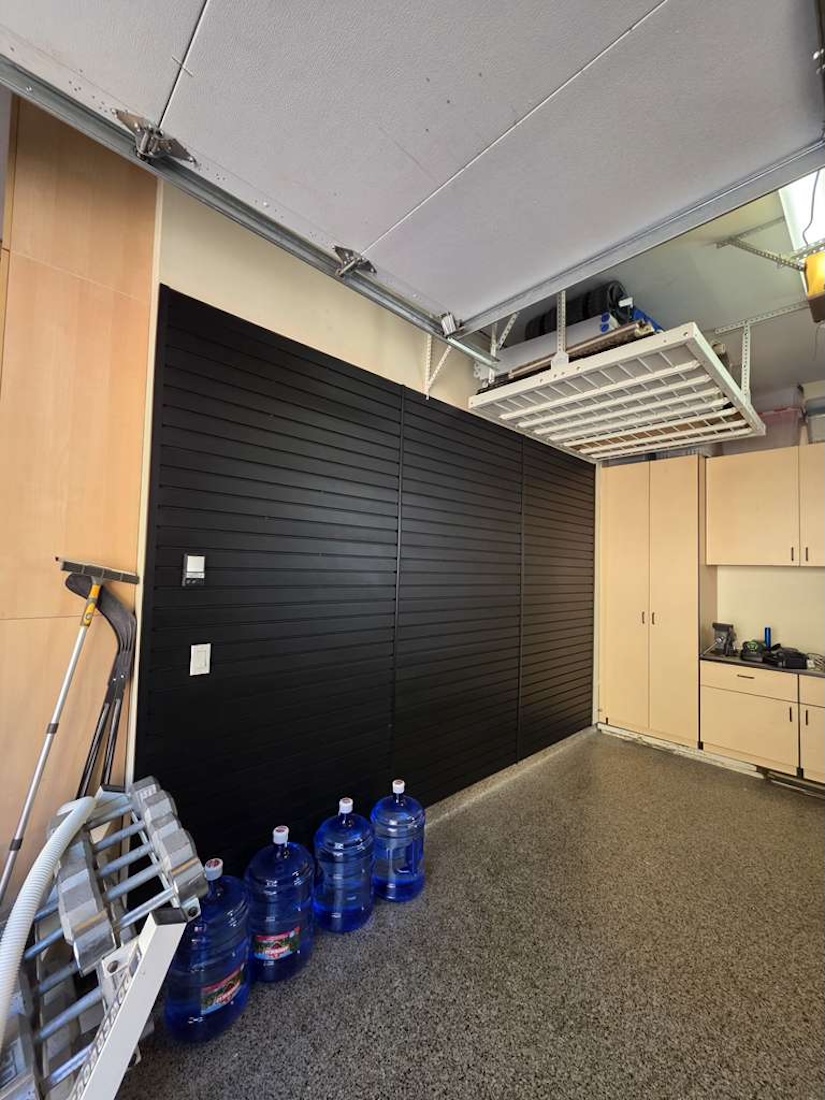 The solution combined overhead racks, custom cabinets, and versatile slatwall. Together, these elements created a balanced design that offered both accessibility and maximum capacity. The best part? The garage still functions as a proper parking space while offering plenty of storage for everyday items.