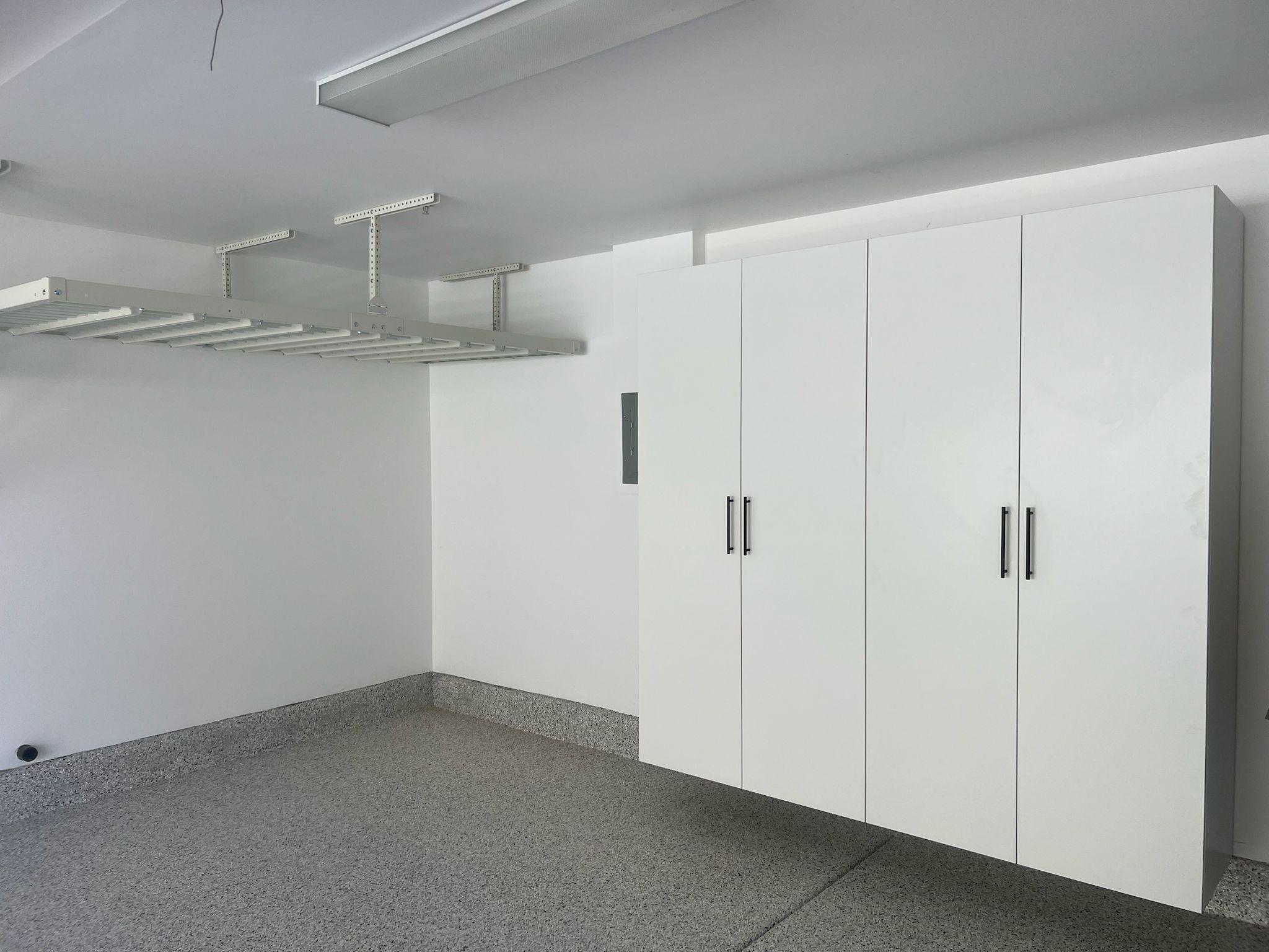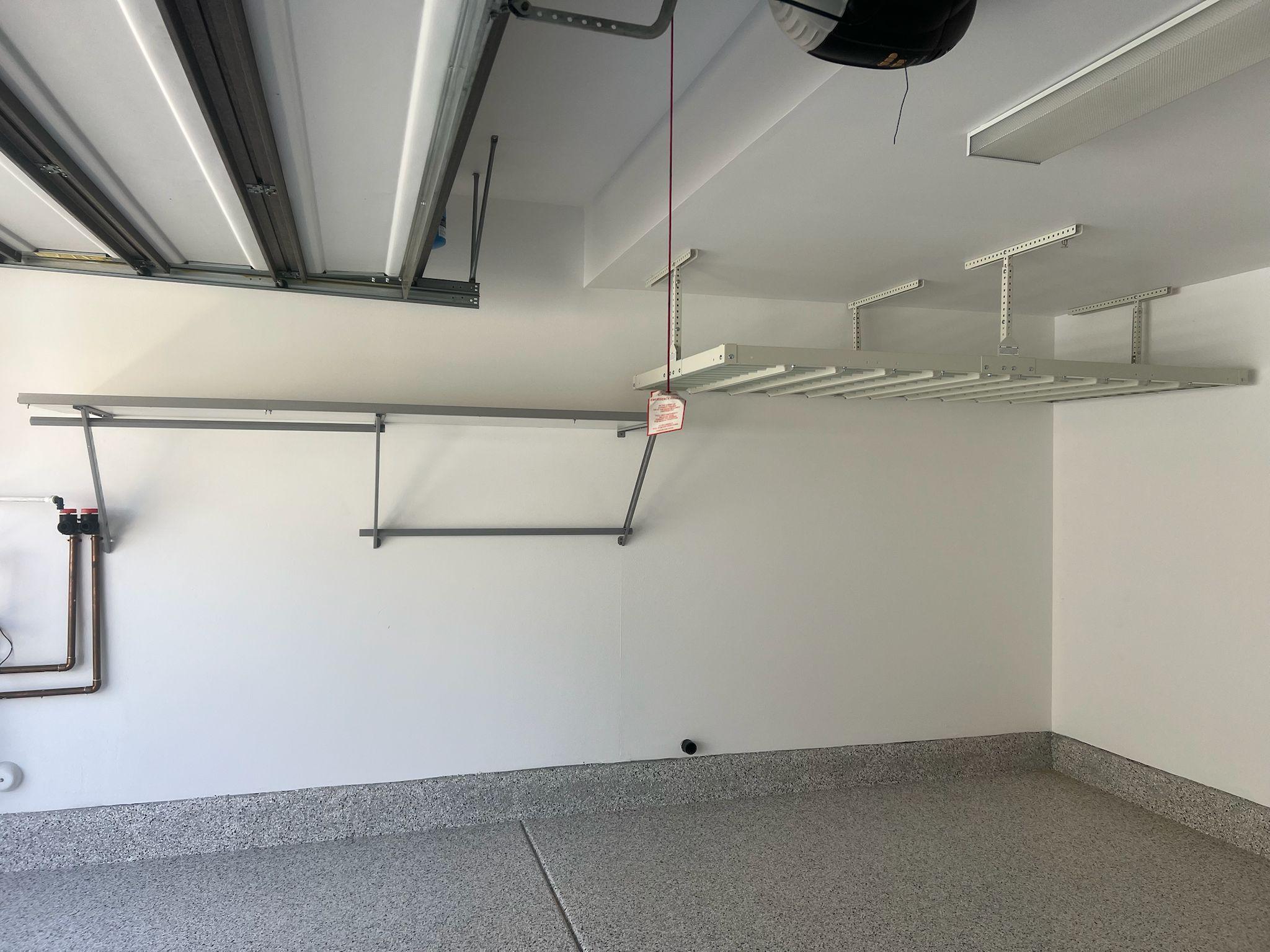 The final design included sleek new flooring, five cabinets for organized storage, overhead racks for maximizing vertical space, and a 15-foot monkey bar system for versatile functionality. While the installation didn’t face major obstacles, the variety of components required precise planning so that nothing overlapped and everything worked together seamlessly. The result is a garage that feels intentional, balanced, and ready to handle everyday use with ease.