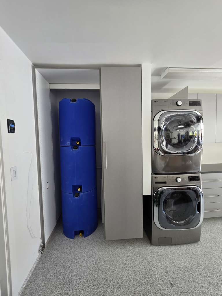 This San Juan Capistrano, CA homeowner was downsizing and worried about losing much-needed storage space. Our team designed a garage system that maximized every inch, building carefully around the laundry units and windows while creating a clever hidden storage space for an emergency water supply.